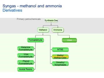 Synthesis gas is a mixture of carbon monoxide and hydrogen used to make ammonia and methanol. Ammonia is used to make the fertilizer urea and methanol is used as a solvent and chemical intermediate. Steam crackers are not to be confused with steam reforming plants used to produce hydrogen and ammonia.