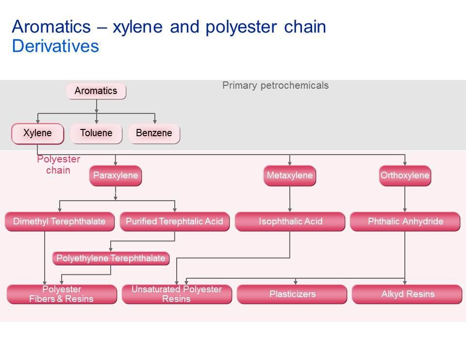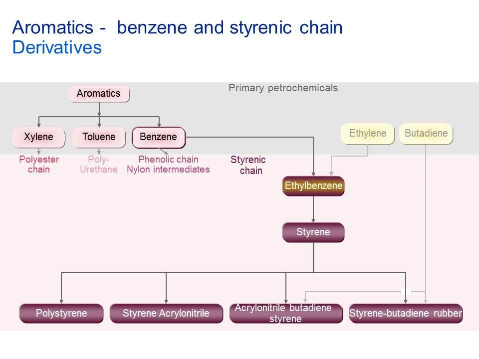Aromatics includes Benzene, toluene and xylenes, as a whole referred to as BTX and primarily obtained from petroleum refineries by extraction from the reformate produced in catalytic reformers using Naphtha obtained from petroleum refineries. Alternatively, BTX can be produced by aromatization of alkanes. Benzene is a raw material for dyes and synthetic detergents, and benzene and toluene for isocyanates MDI and TDI used in making polyurethanes. Manufacturers use xylenes to produce plastics and synthetic fibers.